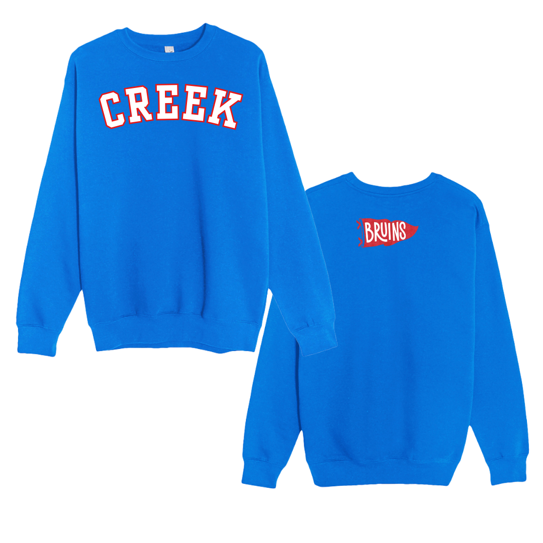 The ultimate blend of comfort and spirit, the Creek Gameday Crew is a classic crewneck made from cozy, super-soft 3-end fleece. Designed with a modern, slimmer fit that still gives you room to move, it’s perfect for layering or wearing on its own. Featuring bold “CREEK” lettering in a raised puff print across the chest, this sweatshirt brings standout style with a touch of retro athletic flair. For added spirit a “Bruins” pennant flat is featured on the back of the sweatshirt! Whether you’re cheering from the stands or hanging out with friends, this crew is your go-to for effortless gameday style.