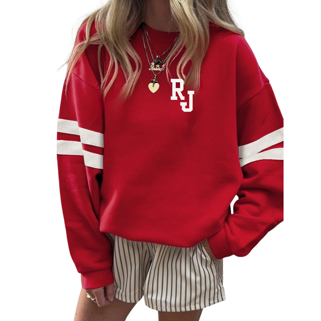 Show your Raider pride with the RJ Varsity Crewneck–a fresh take on classic collegiate style. This cozy drop-shoulder sweatshirt features sporty varsity stripes for a trendy, spirited look. Designed with an oversized fit for ultimate comfort and versatility, it’s made from soft, high-quality fabric perfect for all-day wear. Whether you’re cheering in the stands or keeping it casual off campus, this pullover is a school spirit essential.